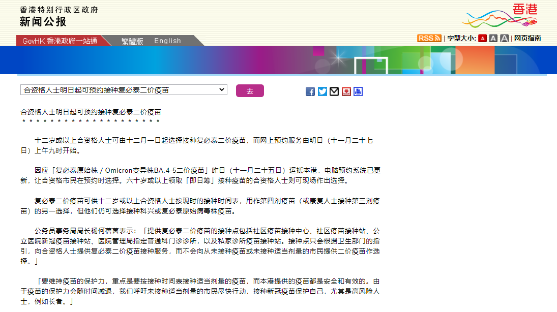 復(fù)星醫(yī)藥方面表示,復(fù)必泰二價疫苗可供12歲或以上人士作第四劑加強針選擇,康復(fù)人士可用作第三劑疫苗接種。根據(jù)香港特區(qū)政府官方又一信息稱,香港市民可于11月27日起可預(yù)約接種,12月1日正式開打復(fù)必泰二價疫苗。